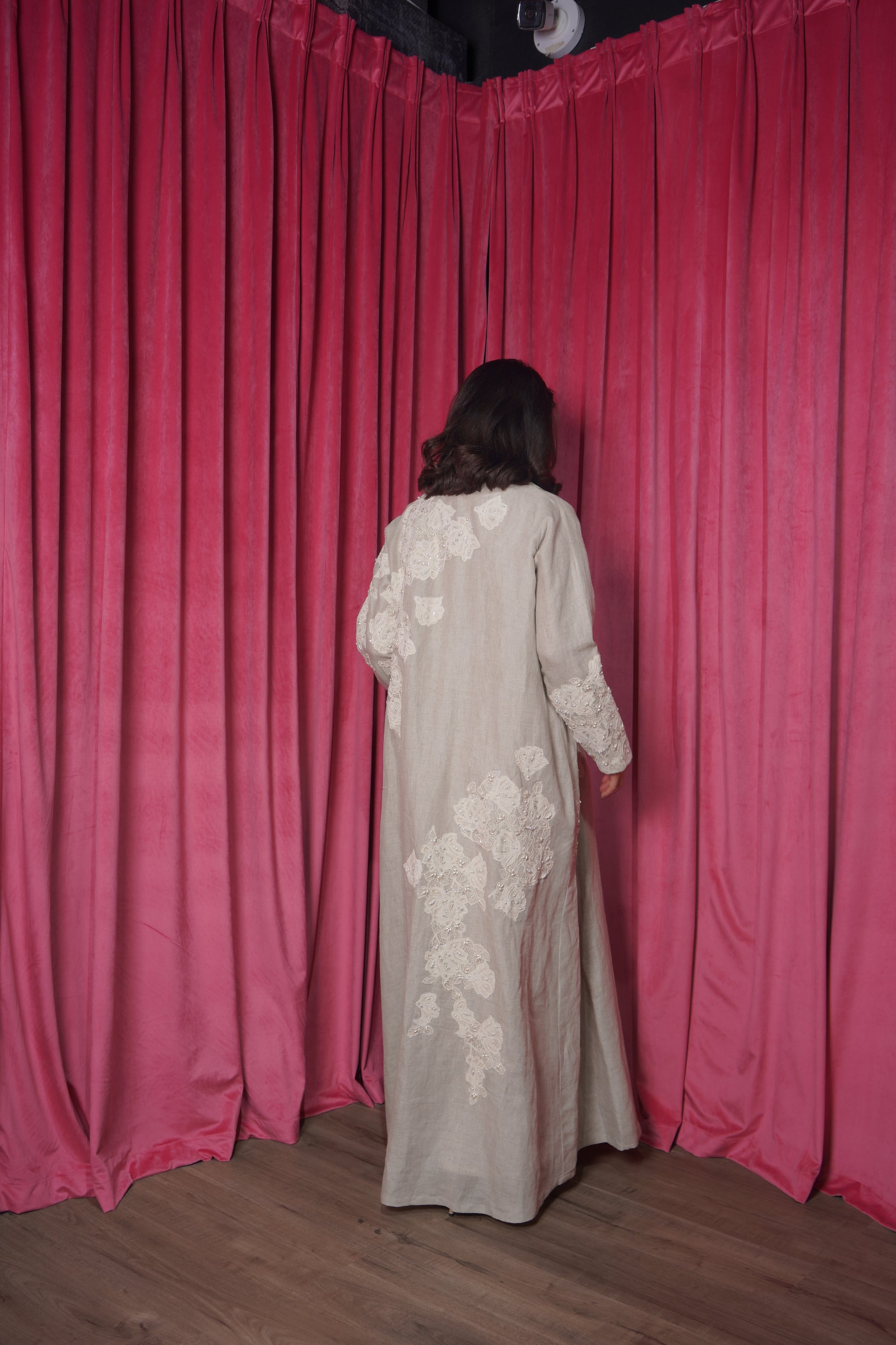 • Coat style abaya, semi tailored cut fitting.